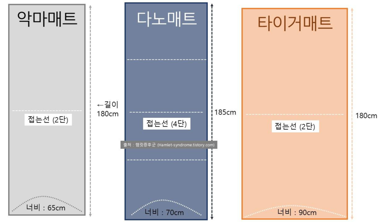 비교 전 '매트 크기가 다 비슷비슷하겠지'하고 생각했는데 막상 비교해보니 크기와 두께 모두 각각 차이가 꽤 있었습니다.